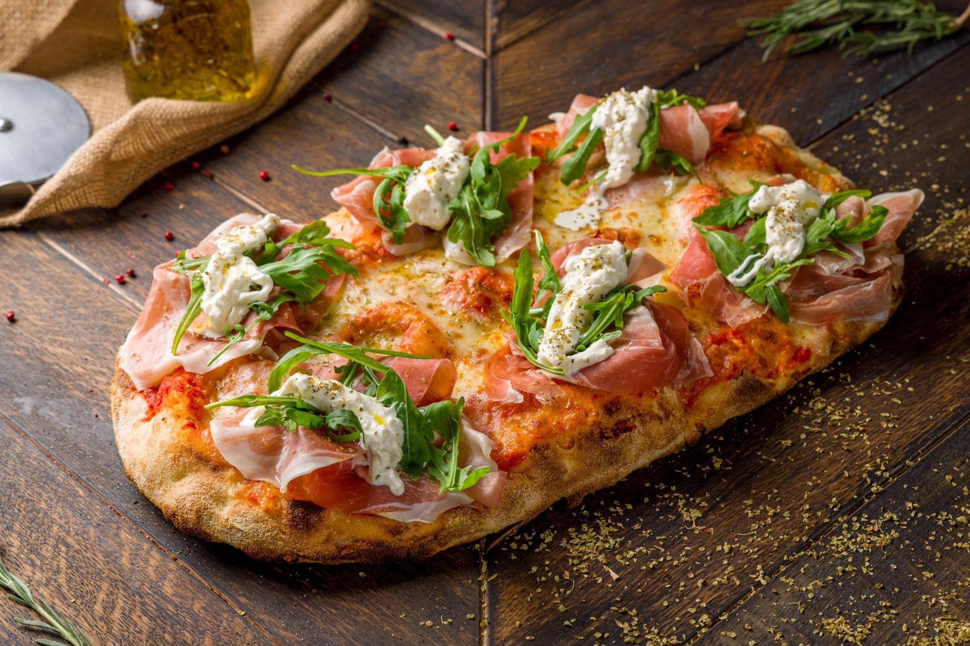 томатный соус. пармская ветчина, руккола, сыр Моцарелла